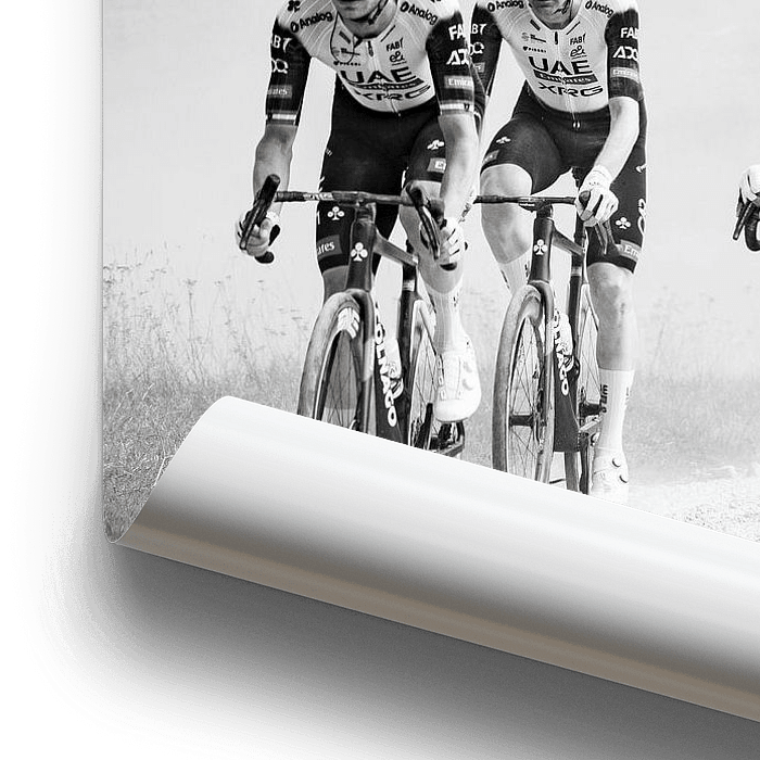 De ploeg van Tadej Pogacar rijdt op kop van het peloton. Later wint Pogi de Strade op een indrukwekkende manier