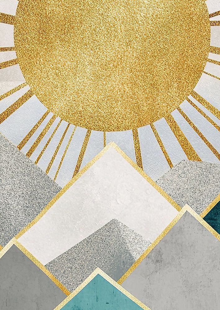 Een abstract landschapschilderij met bergen en een stralende zon of zachte maan, geïnspireerd door de elegantie van Japanse kunst. Het schilderij straalt tijdloze rust en innerlijke kracht uit.