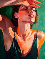Hier ontvouwt zich een sensueel moment tussen licht en schaduw. De warme kleuren strelen de huid, terwijl de zachte pose een mengeling van ontspanning en mysterie suggereert. De hand schermt het gezicht af en de intensiteit van de blik laat ruimte voor verbeelding en emotie. Een werk dat de vrijheid van het moment vastlegt.