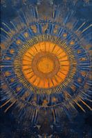 hDit werk toont een intens stralend oranje cirkelvormig centrum, omgeven door diepblauwe en gouden details die doen denken aan een zon in het hart van het universum. De levendige oranje kleur contrasteert prachtig met het diepe blauw, waardoor het centrum nog krachtiger naar voren komt. De cirkelvormige patronen lijken te pulseren en…