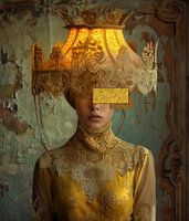 Modern abstracte en romantische afbeelding van een vrouw in een geel kanten jurk met een verlichte lampenkap op haar hoofd. Voor haar oog twee abstracte rechthoeken in de zelfde kleurstelling. Achtergrond is verweerd, doet oud aan in grijs, brons, lichtblauw, aquablauw, groen. Passend bij diverse stijlen en trends, waaronder Fantasie, Grandeur chique en Modern Abstract. True Joy. Artist: Bianca ter Riet