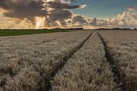De zon schijnt door de wolken boven een tarweveld bij Westeremden in de provincie Groningen.