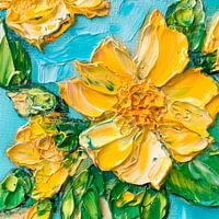 Het schilderij toont felgele bloemen die in levendige penseelstreken zijn gerealiseerd. Hun rijke kleuren contrasteren met de zachtblauwe achtergrond en geven de compositie een vrolijke levendigheid. De dynamische texturen van de bloemblaadjes en de tere groene blaadjes zijn bijzonder opvallend en stralen een gevoel van frisheid en lente uit.