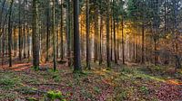 De lage herfstzon zendt haar stralen in de lichte nevel van een herfstbos