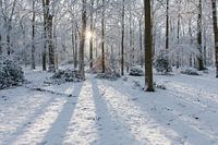 Sneeuw en zonlicht in het Corversbos bij Hilversum, Noord Holland, Netherlands. het bos is in beheer bij Natuurmonumenten. Na vers gevallen sneeuw verandert het bos in een sprookjesbos. Winterlandschap, zonnestralen. kerstkaart