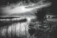 Zwart & wit foto met prachtige landschaps scene in de Hollandse polder. Een oud bootje in een rietkraag aangelegd in een natuurlijke haven die van een kreek overgaat in een groot meer. Een wolken licht geeft indrukwekkende zonnestralen die tussen de wolkenlucht over het landschap stralen.
