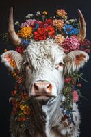 Deze levendige afbeelding toont een witte hooglandkoe, versierd met een prachtige bloemenkroon in een explosie van kleuren. Rode, oranje, roze en blauwe bloemen omlijsten de zachte vacht van de koe, wat een schitterend contrast en een vrolijke sfeer creëert. De delicate details van de bloemen in combinatie met de rustige uitdrukking van de koe geven het kunstwerk een serene, maar tegelijkertijd feestelijke uitstraling. Perfect voor liefhebbers van natuur en kunst die op zoek zijn naar een kleurrijke toevoeging aan hun interieur.