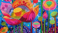Stralende Flora" is een levendige viering van de diversiteit van de natuur, weergegeven in een explosie van kleuren en patronen. Het kunstwerk toont een fantasierijke tuin waar elke bloem uitbarst met zijn eigen unieke energie, waardoor een harmonieuze symfonie van vorm en licht ontstaat. Dit stuk nodigt de kijker uit om zich te verliezen in het levendige tapijt van het leven, waar elk element bijdraagt aan de algehele schittering.