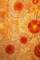 Dit werk straalt de warmte en energie van een zomerse dag uit, met feloranje en gele bloemen die als zonnestralen op een lichte achtergrond lijken te schitteren. De bloemvormen zijn dynamisch en levendig, met concentrische cirkels en stralen die vanuit het middelpunt naar buiten schieten. De textuur en kleuren geven een gevoel van vreugde en vitaliteit, waardoor dit stuk een opbeurende en vrolijke sfeer in elke ruimte brengt. Perfect voor wie een vleugje zomer en energie in huis wil halen.