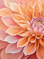 Een levendige close-up legt de ingewikkelde details en warme tinten van een dahlia in volle bloei vast. De bloemblaadjes, variërend van zacht perzik- en zachtroze tot vurig oranje, ontvouwen zich in een betoverende spiraal en trekken de kijker naar het hart van de bloem. Het spel van licht en schaduw accentueert de delicate textuur en…