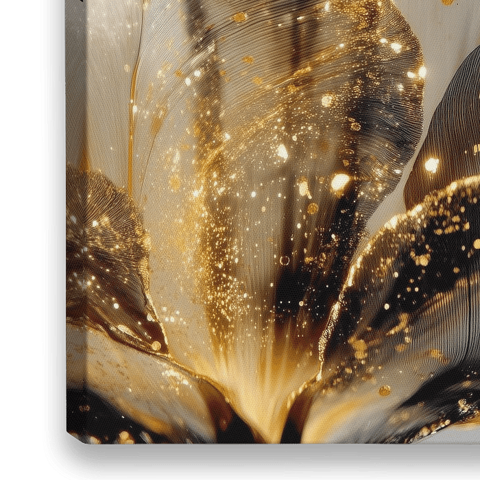 Een delicate, doorschijnende bloem met gloeiende gouden fonkelingen verspreid over de elegante bloemblaadjes, die een magisch en etherisch effect creëren