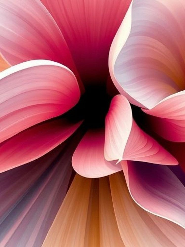 Een levendige en zachtgekleurde close-up van een dahlia-achtige bloem, met talloze overlappende bloemblaadjes in een kleurverloop van roze, oranje en paarse tinten. De belichting benadrukt de delicate textuur en gelaagde complexiteit van de bloem, waardoor een fascinerend en elegant bloemenabstract ontstaat.