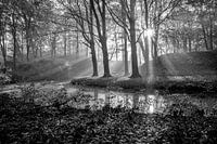Zwart-wit foto van een bos met oude beuken in de herfst. Het zonlicht schijnt in stralen door de lichte mist. Foto is gemaakt op Landgoed Elswout in Noord-Holland.