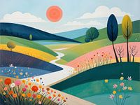 Een idyllische, zonnige dag op het platteland, met de weidse velden in zachte groentinten onder een helderblauwe hemel.