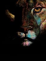 Verken het fascinerende kunstwerk van een leeuwin's gezicht dat tevoorschijn komt uit volledige duisternis, versierd met een palet van levendige tinten. Ondanks de omringende schaduwen zorgt de mix van aantrekkelijke kleuren voor een prachtige uitstraling, die een gevoel van zowel angst als verhoogde alertheid oproept.