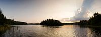 Prachtig stralende ondergaande zon geeft een meer in Zweden een gouden teint. Door de wolk die precies voor de zon ligt krijgt deze een hemelse stralenkrans.
