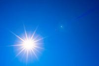 Blauwe, wolkenloze hemel met felle zon als symbool voor de zomer