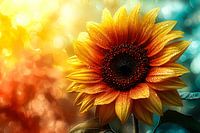 Deze schitterende afbeelding toont een zonnebloem in al haar glorie, met stralende gele en oranje bloemblaadjes die schitteren in het zonlicht. De dauwdruppels op de bloemblaadjes voegen een vleugje frisheid toe, terwijl de kleurrijke achtergrond een warme en levendige sfeer creëert. Perfect als wanddecoratie, deze afbeelding brengt een vrolijke en natuurlijke uitstraling in elke ruimte. Ideaal voor in een woonkamer, kantoor of eetkamer, dit ontwerp brengt direct warmte en energie in je interieur.