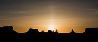 Een silhouet van Monument Valley op de grens van Arizona en Utah bij zonsopkomst