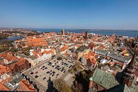 Panorama over de daken van Stralsund, een plaats in Noord-Duitsland bij de brug naar het Eiland Rügen