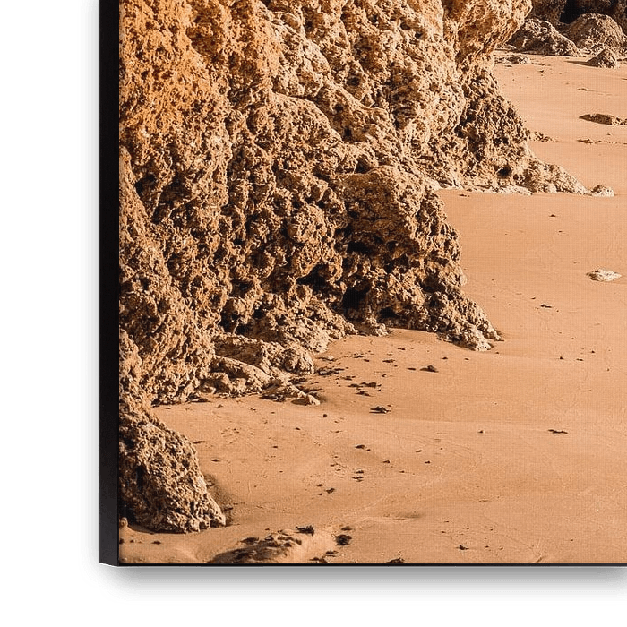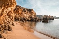 Deze betoverende kustfoto uit Albufeira, Portugal toont een rustig strand omsloten door imposante, goudkleurige kliffen die prachtig afsteken tegen het zachte blauw van de zee. De kleine golfjes kabbelen vredig tegen het warme zand, terwijl de zon een zachte gloed werpt over het landschap. De grillige rotsstructuren en hun reflectie in het kalme water versterken het gevoel van sereniteit en natuurlijke schoonheid. Een ideaal werk voor wie houdt van rustgevende strandtaferelen en de ruige charme van de Algarve-kust.
