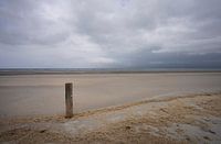 Het strand van Ameland nabij het natuurgebied Het Oerd, op het oostelijke deel van het eiland. Het is een bewolkte dag, regenbuien trekken langs het eiland.