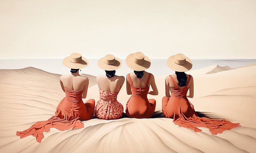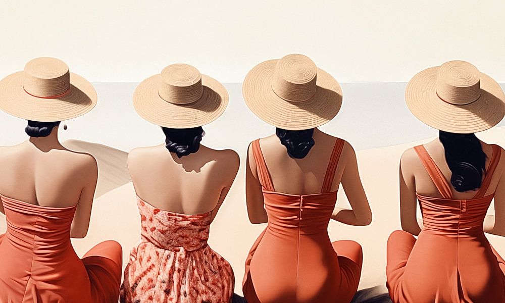 Ze dragen grote rieten hoeden en zomerjurken in oudroze en zalmkleurige tinten.