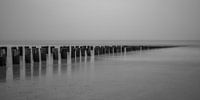 Strand Domburg met golfbrekers in zwart-wit.