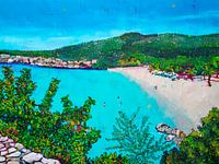 Kleurrijke voorstelling van het bekendste strand van Curaçao Grote Knip van de kunstenaar Renate Rolefes.