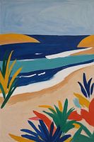 Ontdek de levendigheid en serene schoonheid van deze abstracte interpretatie van een strandtafereel, waarin de vurige tinten van de flora in de voorgrond contrasteren met de rustgevende azuurblauwe golven die zachtjes tegen het zand breken. Het minimalistische landschap, gedomineerd door brede penseelstreken en een rijk kleurenpalet, nodigt de kijker uit om een moment van rust te ervaren terwijl het de essentie van de natuurlijke wereld vastlegt. Deze unieke compositie combineert abstracte kunst met moderne esthetiek, perfect voor het verlevendigen van elke hedendaagse ruimte.