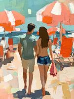 Strand Koppel | Zomer Strand - Op dit schilderij zie je een vrouw en man hand in hand lopen over het strand, omringd door kleurrijke parasols in een zomerse sfeer.