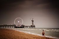 Pier van Scheveningen tijdens een opkomende storm en een toevallige passant tijdens de avondschemer