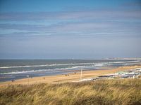 het strand van zandvoort aan aan zee, met huisjes, met mensen die op het strand lopen