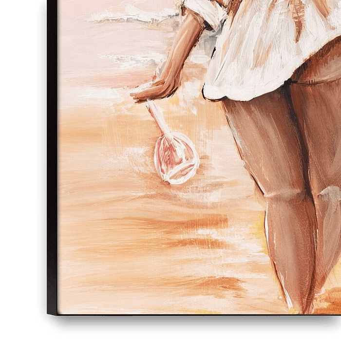 Alles wat ik vandaag nodig heb is het strand, de zee en een goed glas wijn. Enkel gekleed in een wijd wit overhemd loopt de half naakte mooi gebruinde vrouw richting de zee. Met een fles rosé en een wijnglas in haar hand, genietend van het moment op een warme zomerse dag. Het origineel van dit schilderij heb ik op een houten dienblad…