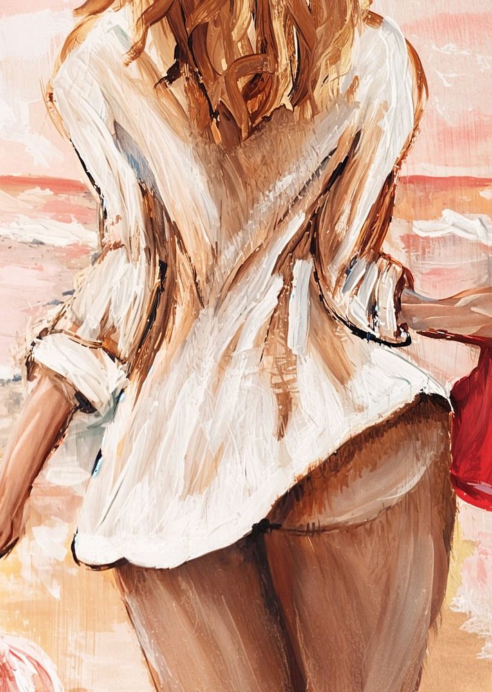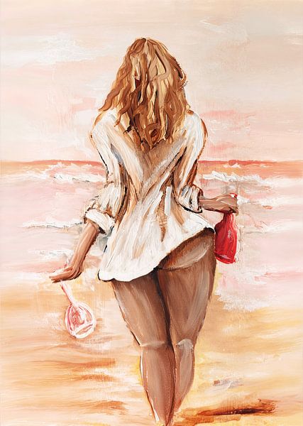 Alles wat ik vandaag nodig heb is het strand, de zee en een goed glas wijn. Enkel gekleed in een wijd wit overhemd loopt de half naakte mooi gebruinde vrouw richting de zee. Met een fles rosé en een wijnglas in haar hand, genietend van het moment op een warme zomerse dag. Het origineel van dit schilderij heb ik op een houten dienblad…