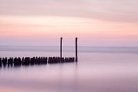 Strand in Zeeland, Nederland bij zonsondergang met golfbreker. Deze foto is gemaakt aan de kust vanaf het strand van Groede aan Zee, Zeeuws-Vlaanderen. Ik heb een lange sluitertijd gebruikt waardoor water en wolken vervagen. Met de mooie zachte pasteltinten zorgt dit voor een serene sfeer.