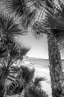 Strand met palmbomen in de buurt van de stad Nerja aan de Costa del Sol in Andalusië in Spanje in zwart-wit .