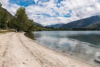 Dit strand bij Lake Wanaka is prachtig. Het is omringd door bomen en de bergen. De weespiegeling in het water maakt de foto van dit bergmeer nog mooier en de wolkenlucht is prachtig.