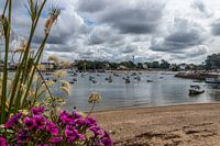 Een lieflijk beeld van een strand bij Sainte Marine, Bretagne. Onder een prachtige wolkenlucht zorgen een paar bloemen, wat boten en een prachtige dorpje aan de overkant van de rivier voor een mooi beeld van het strandje bij Sainte Marine, een klein dorpje in Bretagne.