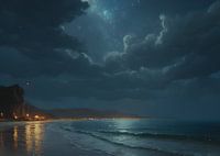 Dit schilderij toont een rustige nacht aan het strand, met zachte golven aan de kust onder een hemel met donkere wolken en fonkelende sterren.