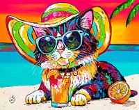 Ontspan en geniet van de sfeer met 'Strand chilling Kat: Zomerse Ontspanning,' een speels en kleurrijk schilderij dat een kat in volledige vakantiemodus weergeeft.