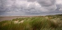 Het strand en de duinen op het Nederlandse Waddeneiland Ameland. Donkere wolken en regenbuien wisselen af met af en toe een beetje zon.