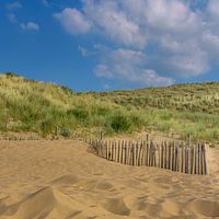 Stukje strand met duinen op een mooie zonnige dag met wat wolken in de lucht.