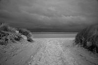 De toegang naar het het strand door de duinen. Donkere wolken boven de zee voorspellen niet veel goeds.