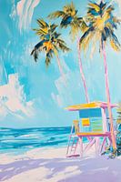 Een tropisch paradijs ontvouwt zich in levendige kleuren: palmgras wiegt zachtjes in de zwoele bries, terwijl een stijlvolle reddingstoren troont op het strand in pasteltinten. De sprankelende zee kust het fijne, witte zand en nodigt je uit om te ontspannen. Hemelsblauw en zonneschijn beloven onvergetelijke dagen vol ontspanning en…