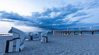 Strandstoelen op het strand en de pier in de badplaats Zingst aan de Oostzee bij schemering, Fischland-Darß-Zingst, Mecklenburg-Vorpommern, Duitsland