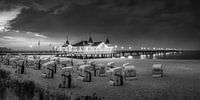 Koop de foto Strand en pier van Ahlbeck in de avond. Zwart-wit beeld. van Manfred Voss, Zwart-Wit Fotografie als print op canvas, aluminium dibond, (ingelijste) fotoprint, behang en ArtFrame. Voor jou op maat geprint in Fine-Art kwaliteit.