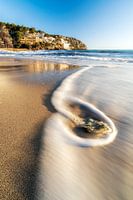 Koop de foto Strand in Mallorca bij zonsondergang met golven die op het strand rollen van Daniel Pahmeier op canvas, aluminium dibond, (ingelijste) fotoprint, behang en ArtFrame, op maat geprint in Fine-Art kwaliteit.