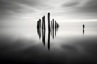 Golfbreker op het strand met ochtendmist in zwart-wit.
