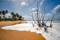 Sri Lanka heeft een prachtige kust met tropische stranden en mooie baaien. De palmbomen wn de dode boom in het water maken het plaatje compleet.